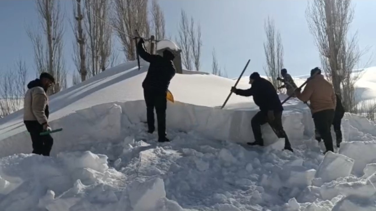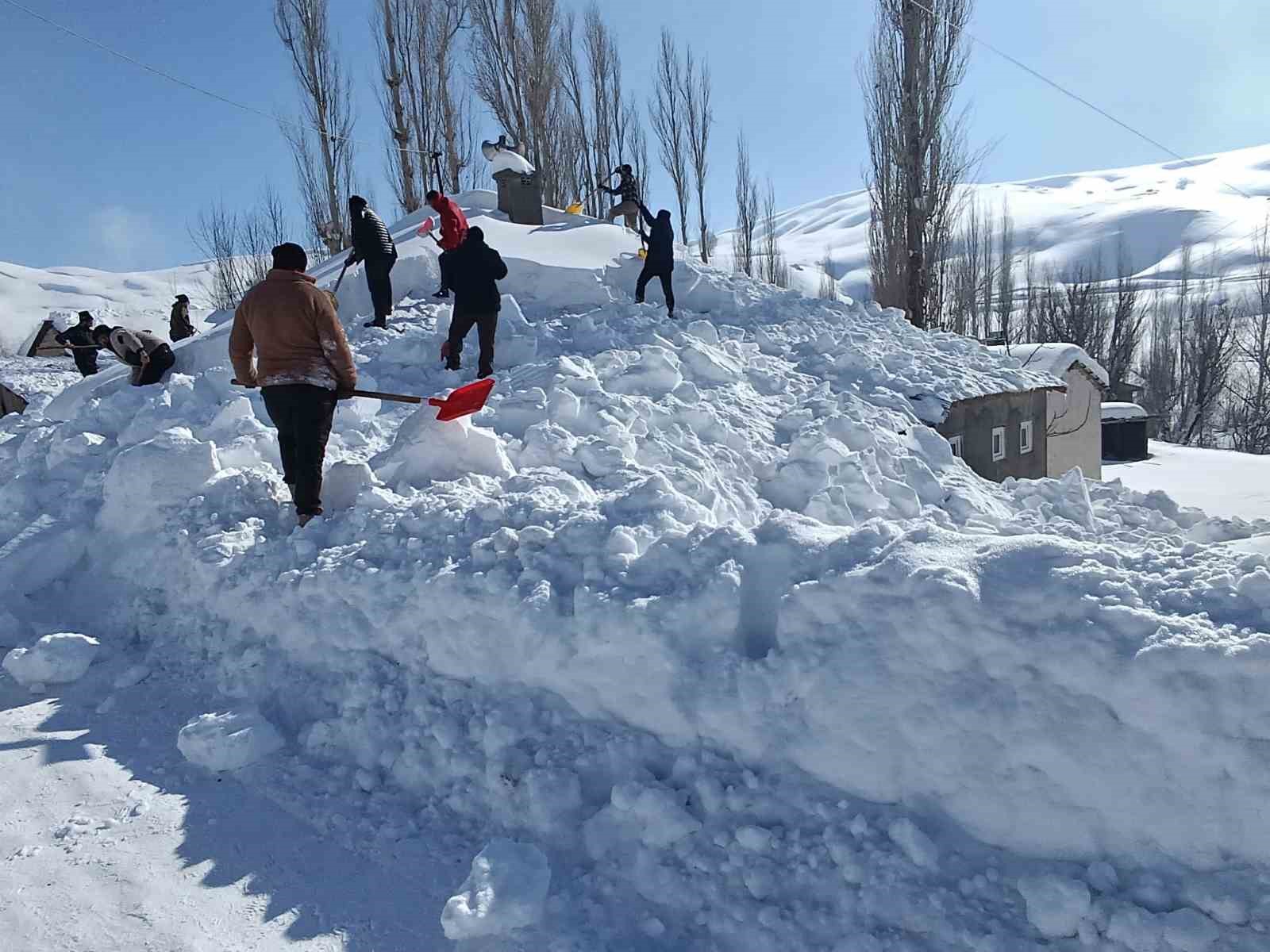 Hakkari’nin Yüksekova ilçesinde yoğun kar yağışının ardından karla kaplanan cami ve evlerin damları köy sakinlerince imece usulü temizlendi.