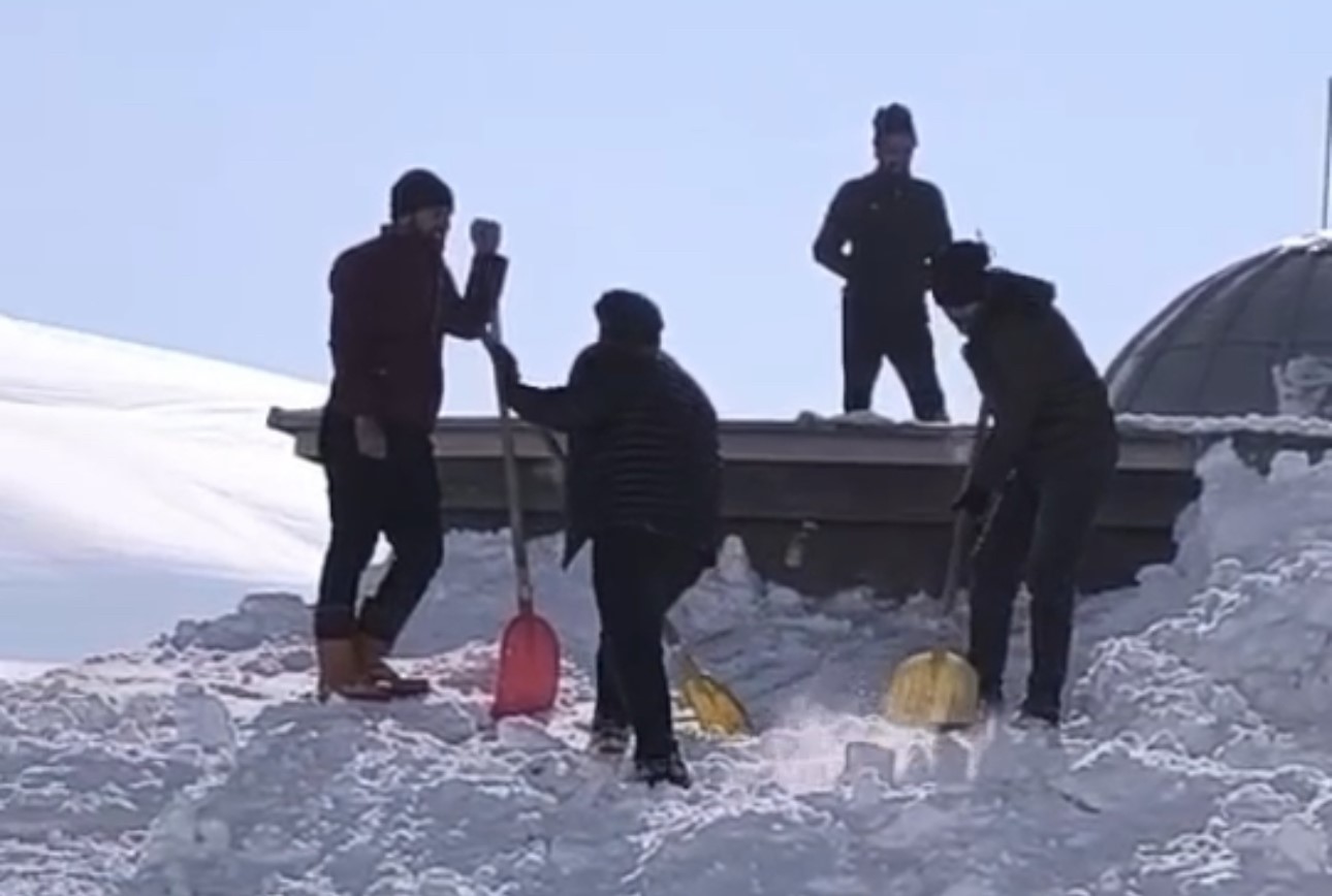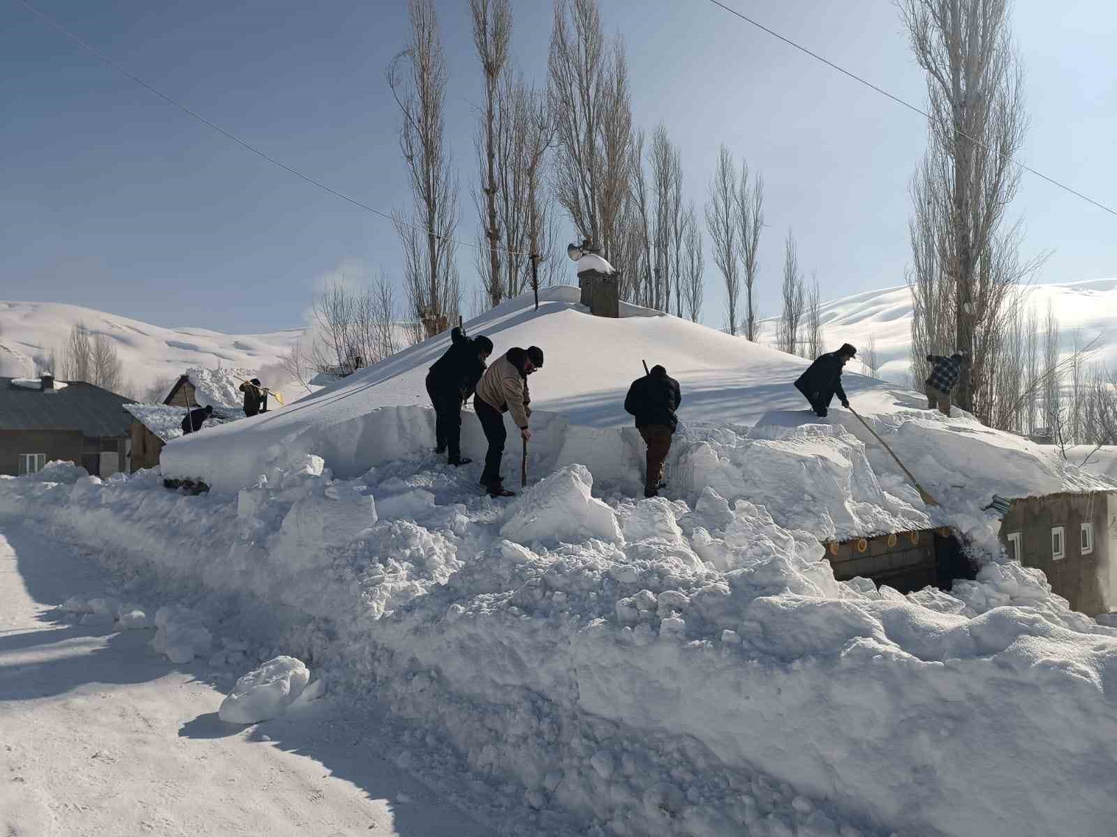 Hakkari’nin Yüksekova ilçesinde yoğun kar yağışının ardından karla kaplanan cami ve evlerin damları köy sakinlerince imece usulü temizlendi.